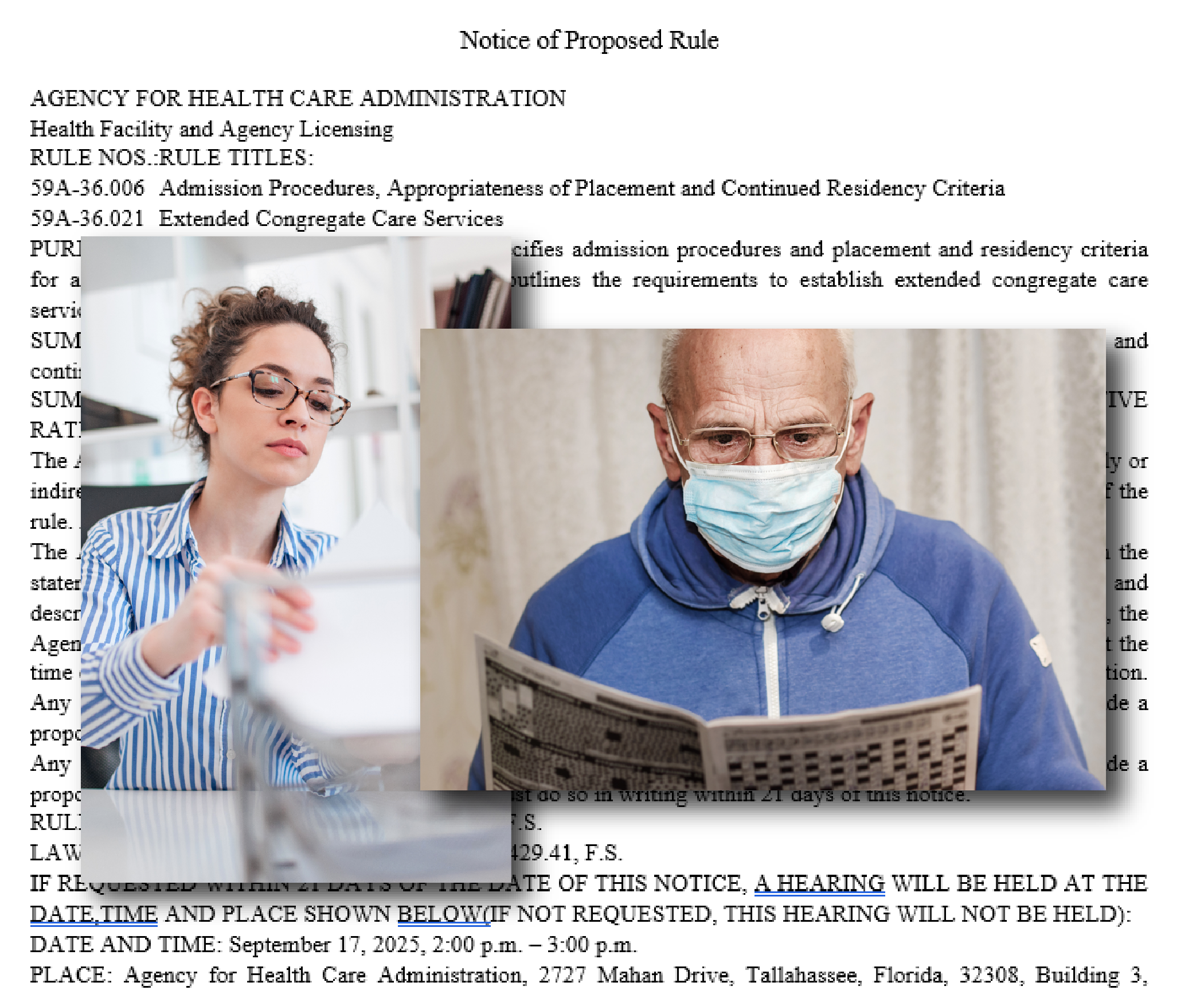 The Agency for Health Care Administration’s new proposed rule, published yesterday (8/25), will relax admission restrictions, giving the administrator leeway to make their decision within certain guidelines. The proposal allows people diagnosed with or having symptoms of a respiratory illness to be admitted to an assisted living facility at the administrator’s discretion if appropriate droplet precautions are implemented by staff. At the advice of stakeholders, this latest rule adds that appropriate precautions are those that are recommended by nationally accepted standards, the local county health department, and the ALF’s own policies at the time of the individual’s admission. If requested, the Agency will schedule a rule hearing for September 17 at 2:00 p.m.